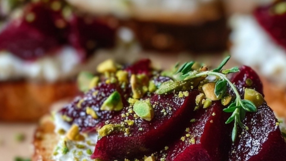 🧾 INGREDIENTSCrostini Base1 baguette, sliced into 1.5 cm (½ inch) roundsOlive oil, for brushingToppings2 medium beets, roasted and cubed150g goat cheese (soft, spreadable)1 tbsp Greek yogurt or cream (to lighten the cheese)Salt & pepper, to taste1 tbsp fresh thyme leaves3 tbsp chopped pistachiosGlaze2 tbsp honey2 tbsp pomegranate molassesPinch of saltOptional: splash of balsamic vinegar🔥 INSTRUCTIONSRoast Beets: Wrap whole beets in foil, roast at 200°C (400°F) for 45–60 min. Peel and cube once cooled.Toast Crostini: Brush baguette slices with olive oil. Bake at 200°C (400°F) for 8–10 min until golden.Whip Cheese: In a bowl, mix goat cheese with yogurt until creamy. Add salt and pepper to taste.Make Glaze: In a small saucepan, gently heat honey, pomegranate molasses, and a pinch of salt. Simmer 2–3 min until syrupy.Assemble: Spread whipped goat cheese on each crostini. Top with beet cubes, a drizzle of glaze, thyme, and crushed pistachios.Serve: Finish with a final drizzle of glaze and a pinch of flaky salt if desired.⏱️ TIMINGPrep: 15 minRoast: 45–60 minAssembly: 10 minMakes: ~18 tapas slices
