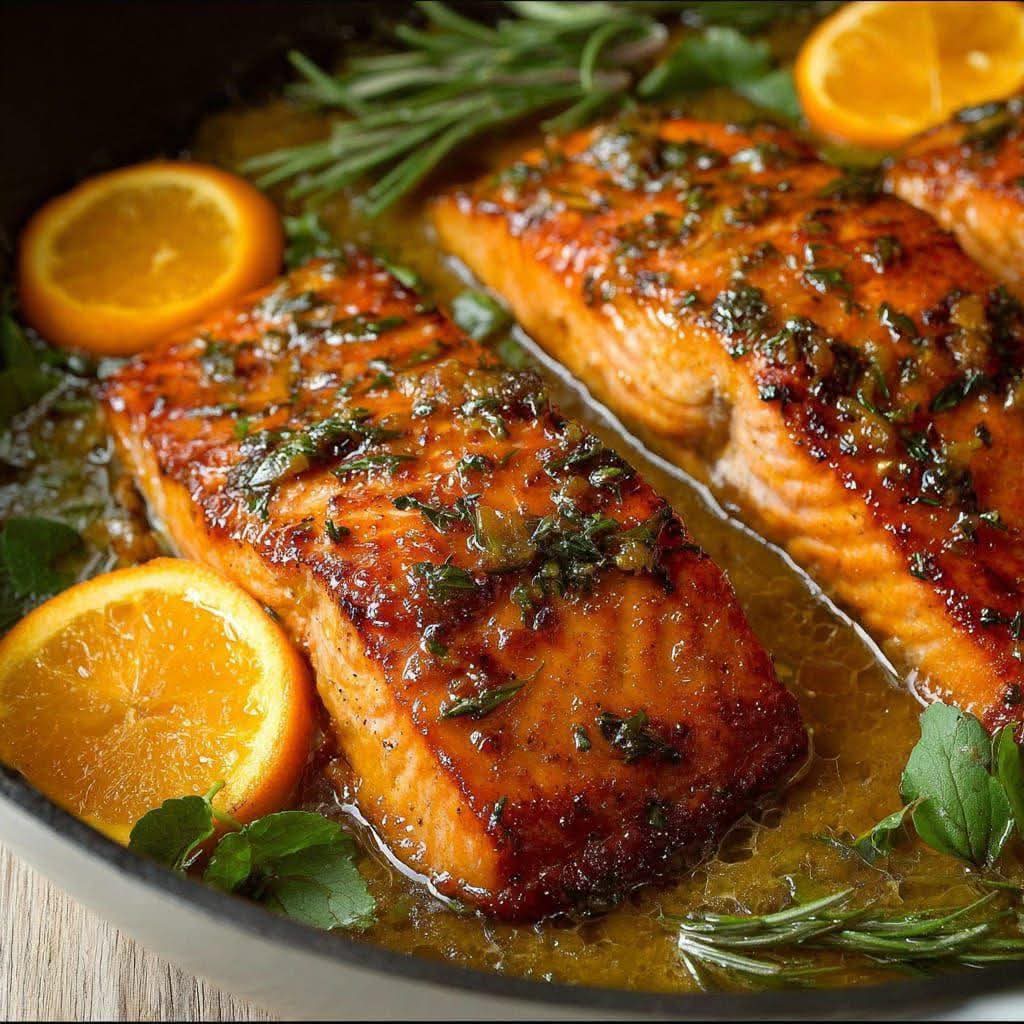 Perfect β Hereβs just the Orange Glazed Salmon Recipe β clear, simple, and ready to cook π§‘ππ Orange Glazed Salmon RecipeYield & TimeYield: 4 servingsPrep Time: 10 minutesCook Time: 15 minutesTotal Time: 25 minutesIngredients4 salmon fillets (about 6 oz each, skin on or off)Salt and black pepper, to taste2 tbsp olive oil or unsalted butter1 cup fresh orange juice (about 2 large oranges)1 tbsp orange zest3 tbsp honey (or maple syrup)2 tbsp soy sauce2 cloves garlic, minced1 tsp cornstarch + 2 tbsp water (optional, for thickening)1β2 sprigs fresh rosemary or thymeGarnish: fresh orange slices, rosemary sprigsInstructionsSeason Salmon β Pat salmon fillets dry, season with salt and pepper.Make the Glaze β In a saucepan, combine orange juice, zest, honey, soy sauce, and garlic. Simmer 5β7 minutes until slightly reduced. Stir in cornstarch slurry if you want it thicker.Cook Salmon β Heat olive oil or butter in a skillet over medium-high heat. Place salmon skin-side down, sear 3β4 minutes. Flip and cook another 2β3 minutes until nearly cooked through.Glaze & Finish β Pour orange glaze into skillet, spoon over salmon, and let simmer 1β2 minutes until glossy and fully coated.Serve β Plate salmon, drizzle with extra glaze, and garnish with rosemary and orange slices.β¨ Result: Juicy, tender salmon coated in a sweet, tangy orange glaze with savory depth β elegant yet quick for any dinner.Enjoy β£οΈ