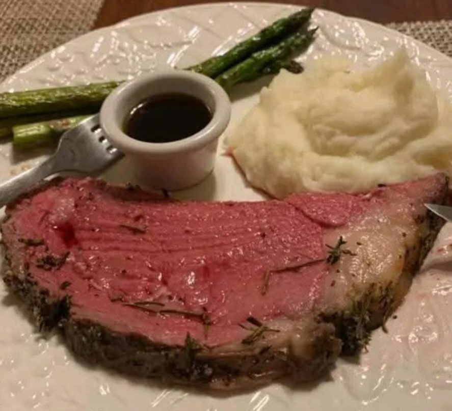 Ingredients :1prime rib roast with or without bone (any size)Garlic powderSaltPepperDirections :Preheat oven to 550F degrees.Make a rub of salt, pepper and garlic powder and apply to meat. Place meat in a shallow roasting pan fat side up.Roast at 550 at 5 minutes per pound for RARE, or 6 minutes per pound for MEDIUM and 7 minutes per pound for WELL DONE.Turn off oven at the end of cooking time and DO NOT OPEN OVEN DOOR FOR TWO HOURS.At the end of the 2 hours, remove meat from oven to slice; it comes out perfect everytime.Works the same with Roast beef. Try it you won’t be disappointed.ENJOY!!