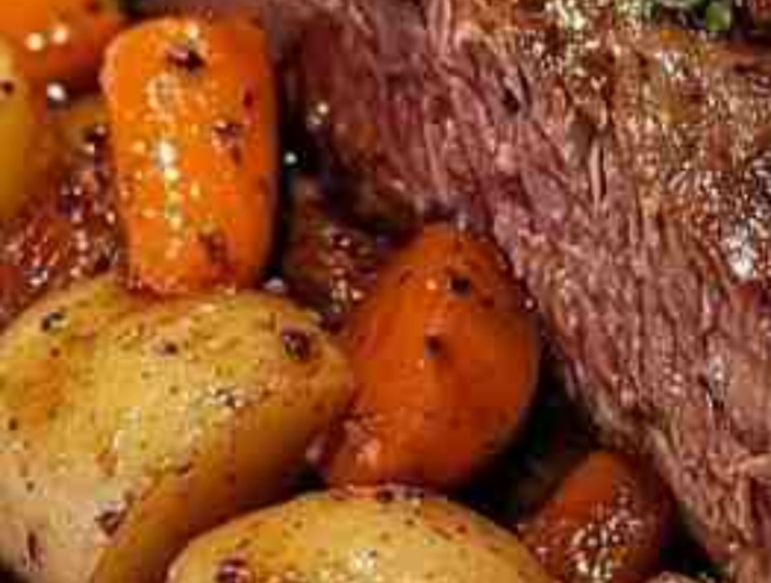 IntroductionPot roast is the ultimate comfort food—tender, juicy beef slow-cooked with vegetables in a flavorful broth. This classic dish combines a hearty chuck roast with carrots, potatoes, and onions, all simmered together until melt-in-your-mouth perfection. It’s a one-pot meal that’s simple to prepare yet feels like a special family dinner.Ingredients3–4 pound chuck roast1 pound baby carrots1 pound small potatoes (Yukon gold or red)1 onion, diced4 cloves garlic, minced2 cups beef broth1 cup red wine (optional, for richer flavor)2 tablespoons tomato paste2 tablespoons Worcestershire sauce2 tablespoons olive oil2 sprigs fresh rosemary (or 1 teaspoon dried)2 sprigs thyme (or 1 teaspoon dried)2 bay leavesSalt and black pepper, to tasteInstructionsPrepare the RoastPat the chuck roast dry with paper towels.Season generously with salt and black pepper.Sear the MeatHeat olive oil in a large Dutch oven over medium-high heat.Sear the roast on all sides until well browned, about 4–5 minutes per side. Remove and set aside.Sauté AromaticsIn the same pot, add onion and garlic. Sauté for 2–3 minutes until fragrant.Deglaze & Build SaucePour in red wine (if using) to deglaze the pot, scraping up browned bits.Stir in tomato paste and Worcestershire sauce.Add beef broth, rosemary, thyme, and bay leaves.Slow CookReturn the roast to the pot.Add carrots and potatoes around the meat.Cover with a lid and simmer on low heat for 3–4 hours, or until the beef is fork-tender.(Alternatively, bake in a preheated oven at 325°F/160°C for 3–4 hours.)ServeDiscard bay leaves and herb sprigs.Slice or shred the roast and serve with the vegetables and rich broth.Serving SuggestionsServe with crusty bread to soak up the delicious gravy.Pair with a side salad for freshness.Leftovers make amazing sandwiches or can be shredded into soups.Tips & VariationsMake-ahead: The roast tastes even better the next day as flavors deepen.Thicker gravy: Mix 2 tablespoons flour with 2 tablespoons water, then stir into the cooking liquid during the last 10 minutes.Slow Cooker Option: After searing, transfer everything to a slow cooker and cook on low for 8 hours.✨ This Pot Roast with Carrots and Potatoes is the perfect family dinner—hearty, flavorful, and comforting. With simple ingredients and slow cooking, you get a wholesome meal that feels like home.