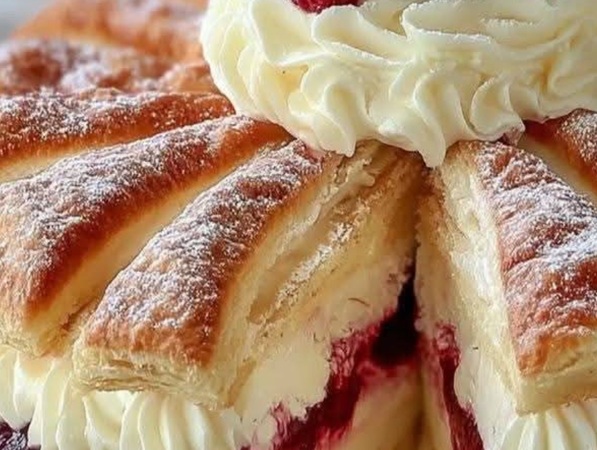 - Assemble the Cake: Once the puff pastry layers have cooled, place one sheet on a serving platter as the base. Spread a layer of raspberry jam evenly on top. Then, spread a generous amount of the cream filling over the jam layer. Place the second sheet of puff pastry on top, gently pressing it down to create a sandwich.
